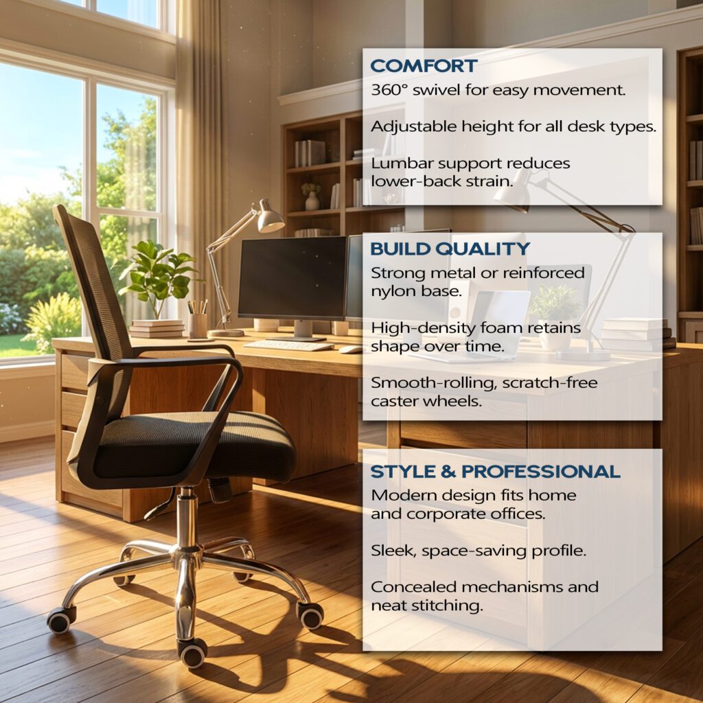 Upgrade your workspace with office chairs designed for comfort, support, and long‑lasting performance. Whether you’re tackling spreadsheets or sketching your next big idea, the right ergonomic office chair helps you stay focused and comfortable. Our curated collection features adjustable designs, premium materials, and built‑in lumbar support—so you can sit smarter, work better, and feel the difference all day long.