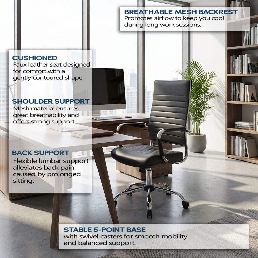 Features: Cushioned soft foam base Fixed armrests Stylish executive design Fully height adjustable Faux leather material Full seat tilt &…
