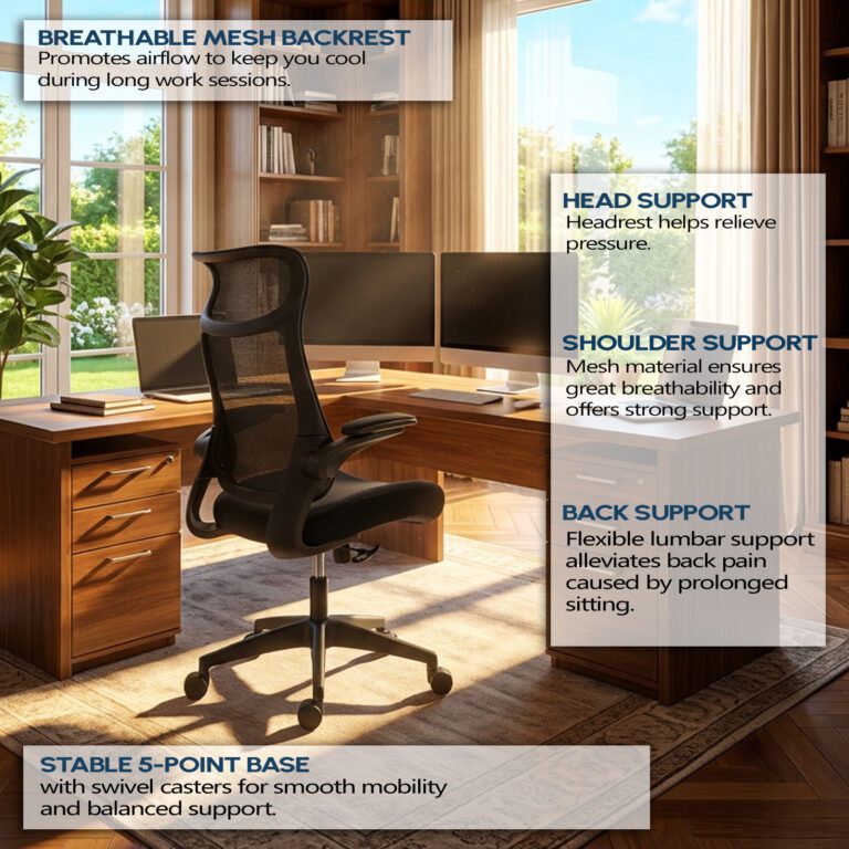 Features: Cushioned soft foam base Retractable, flip-up armrests Spine shaped back design Fully height adjustable Breathable textile mesh backrest Full…