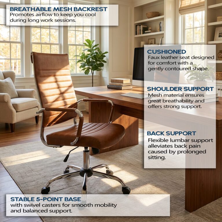 Features: Cushioned soft foam base Fixed armrests Stylish executive design Fully height adjustable Faux leather material Full seat tilt &…